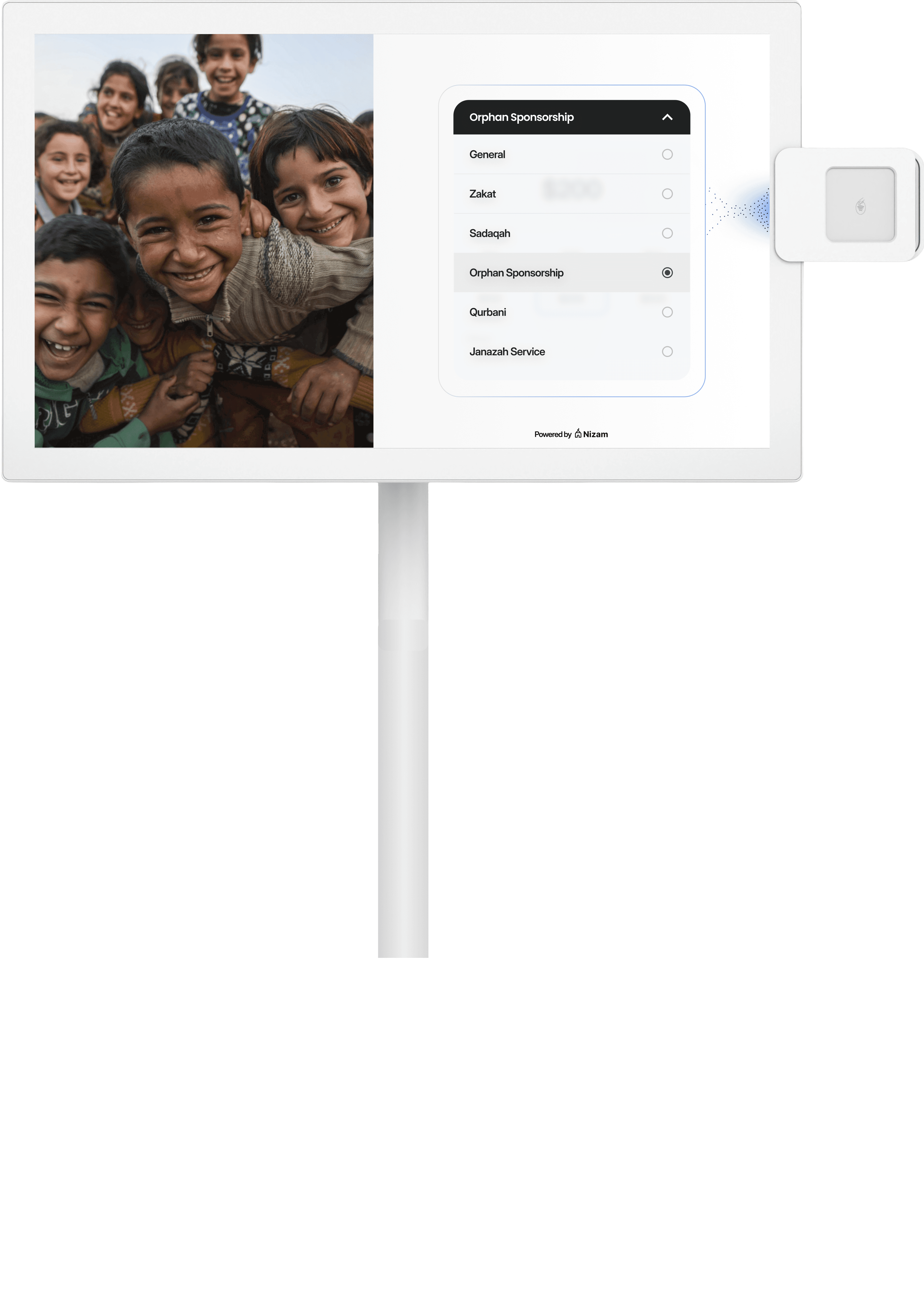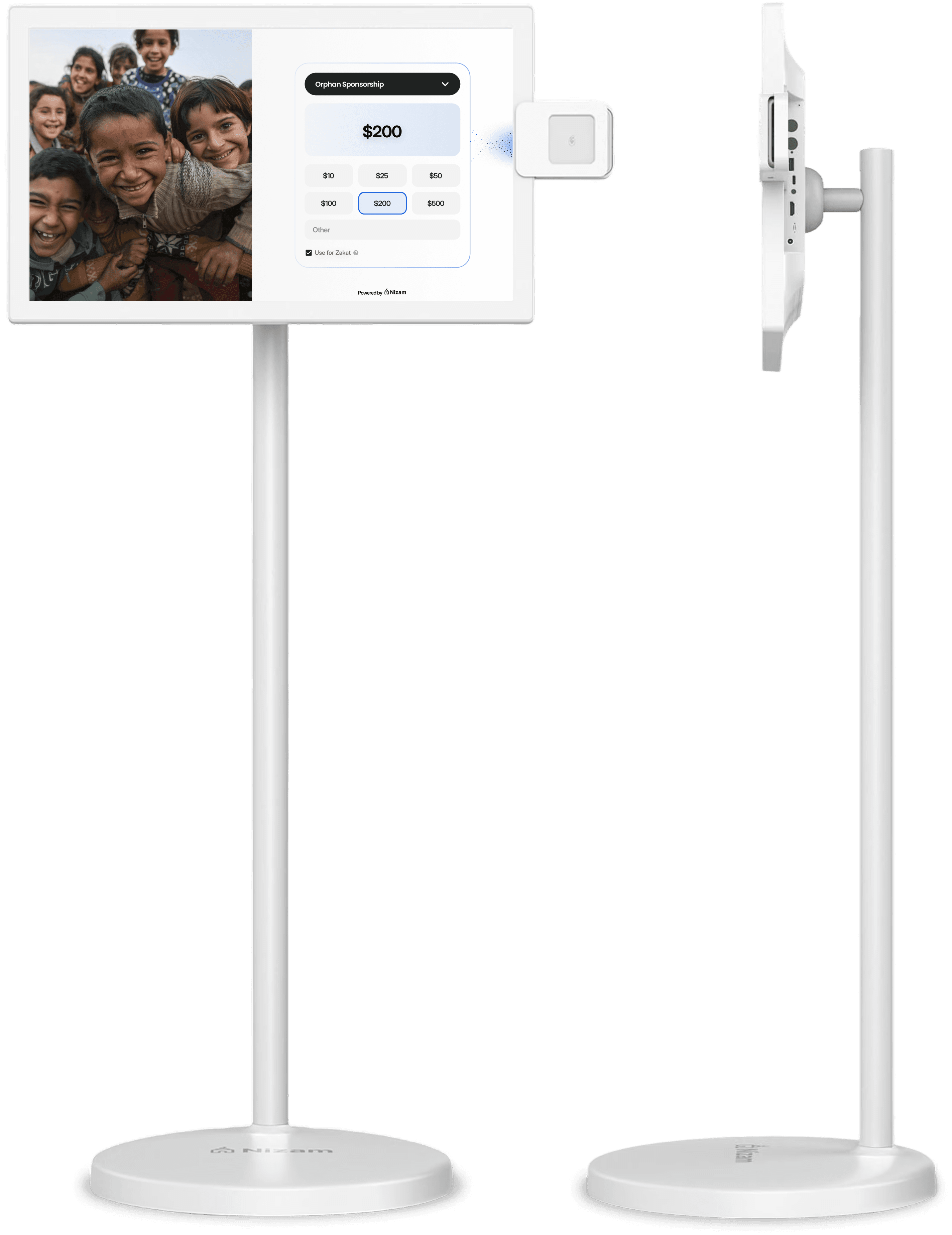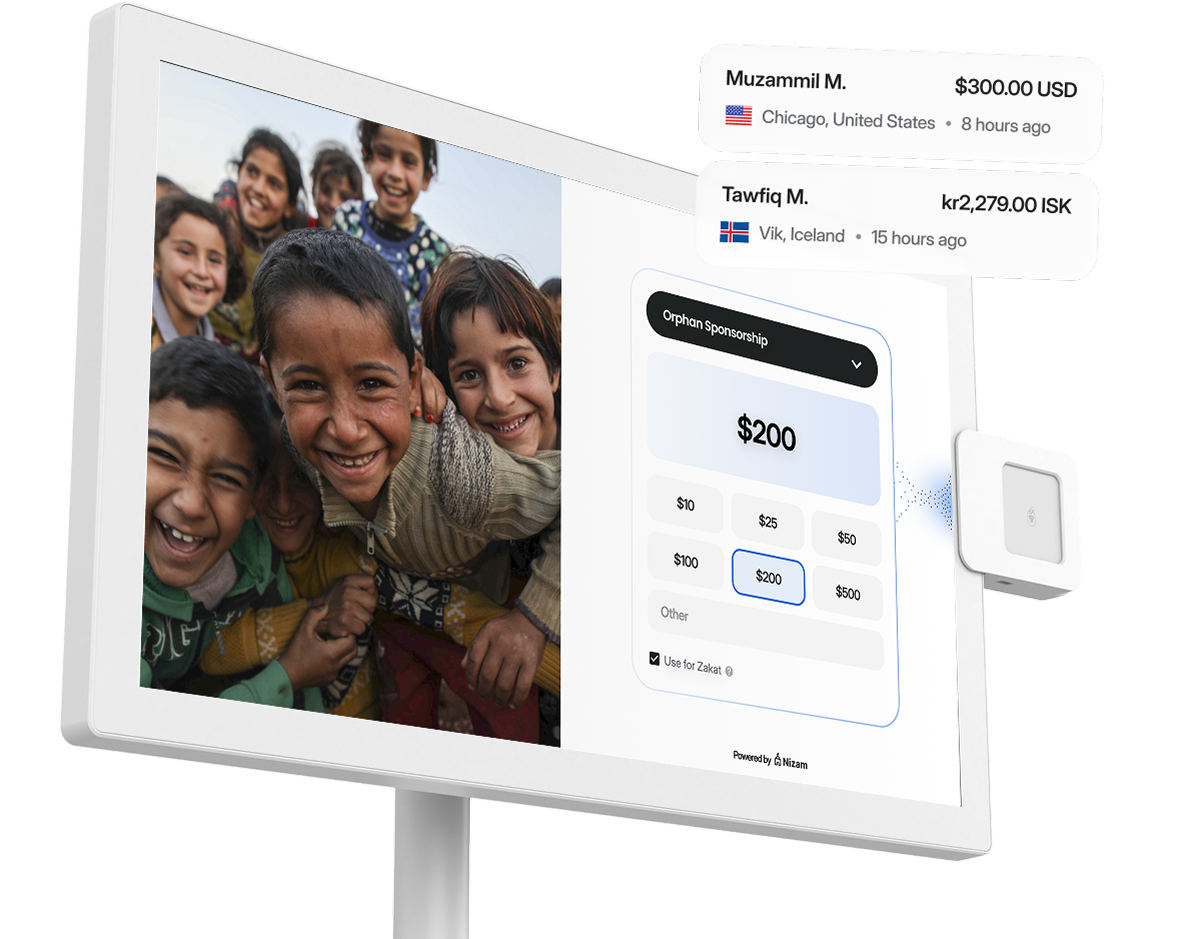 StandPro is designed to move with your community. A slim 21.5” touchscreen, smooth-rolling base, and built-in battery let you place it where giving happens — Jumu’ah, Ramadan fundraisers, NGO galas, or community dinners.