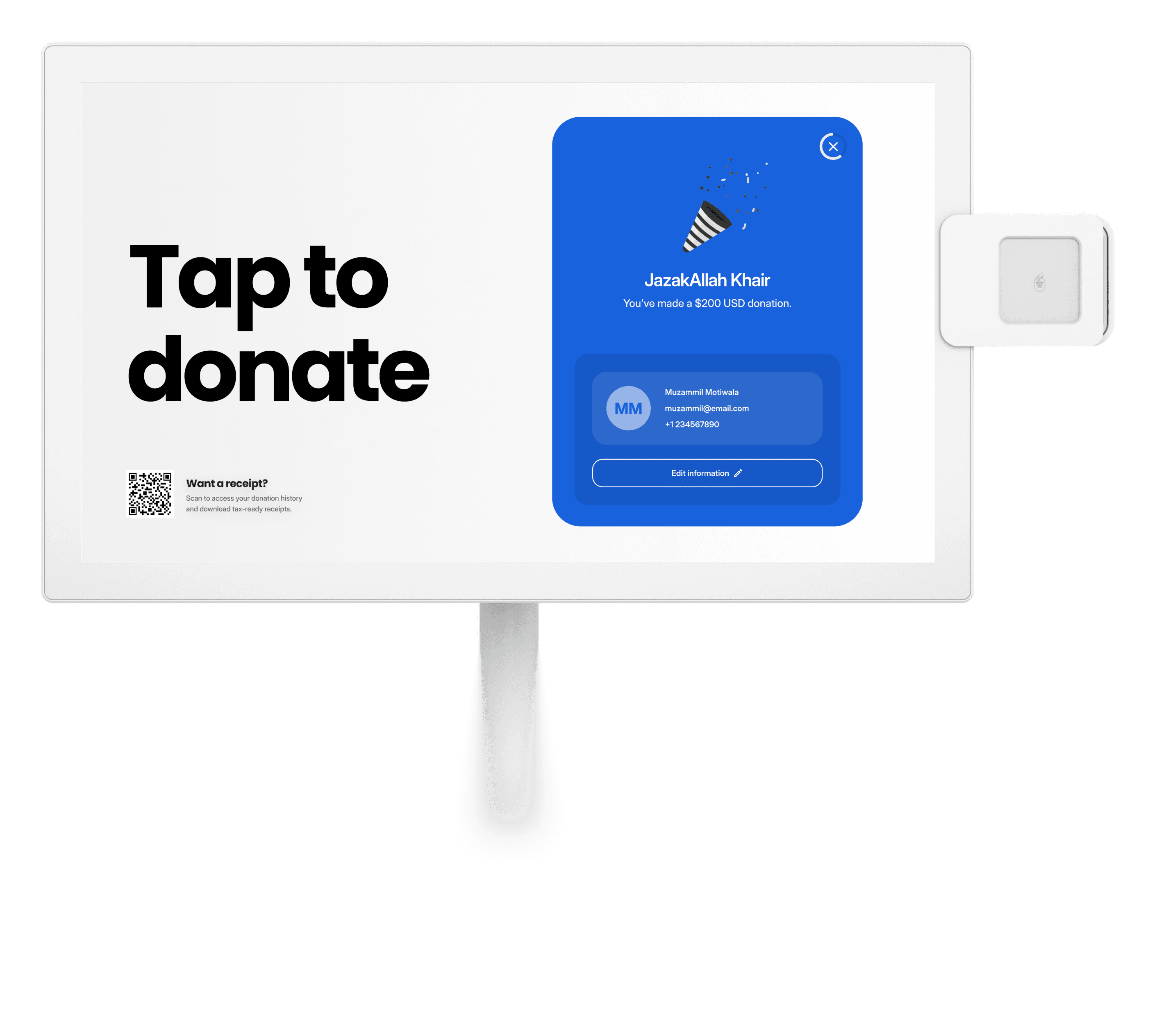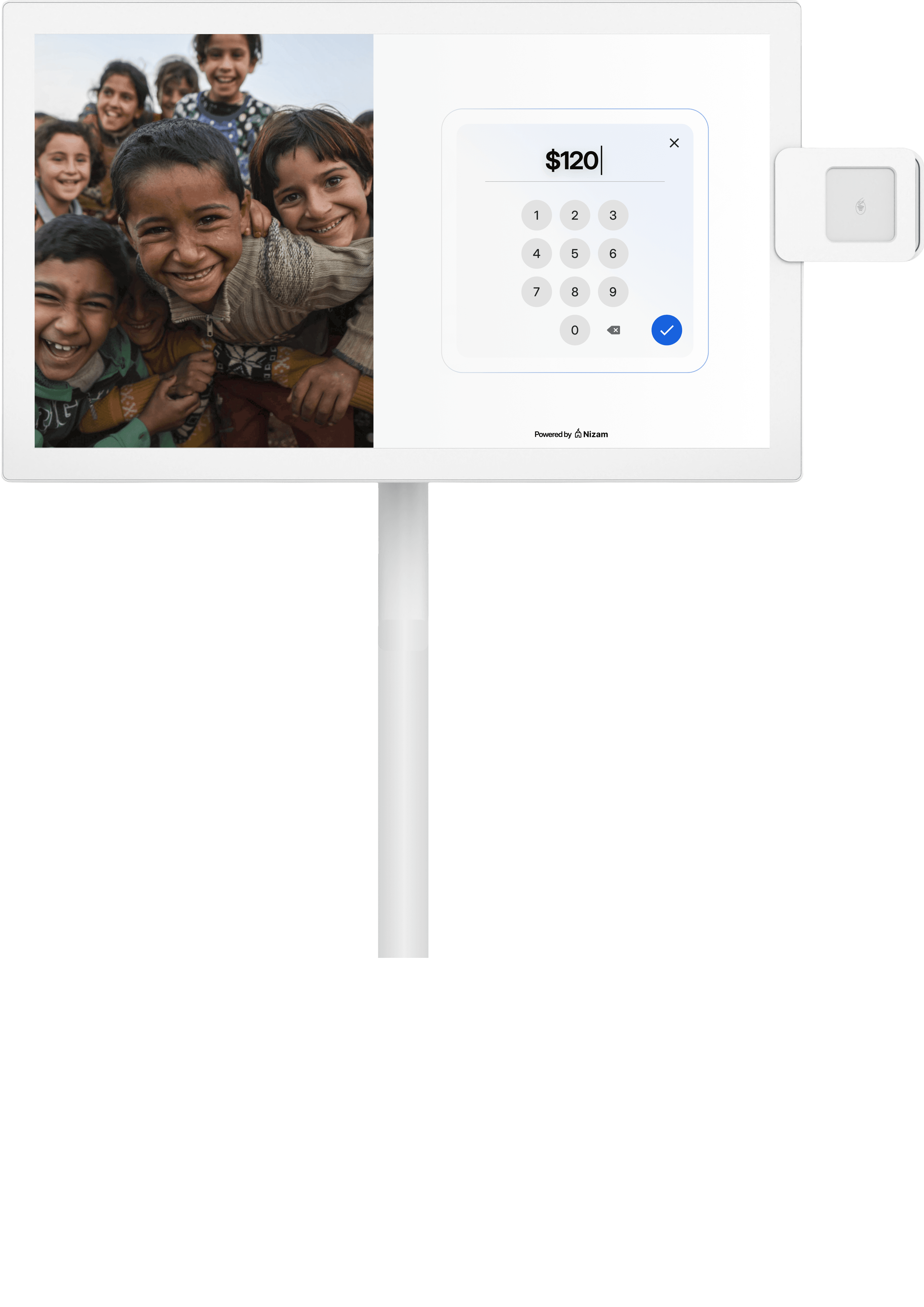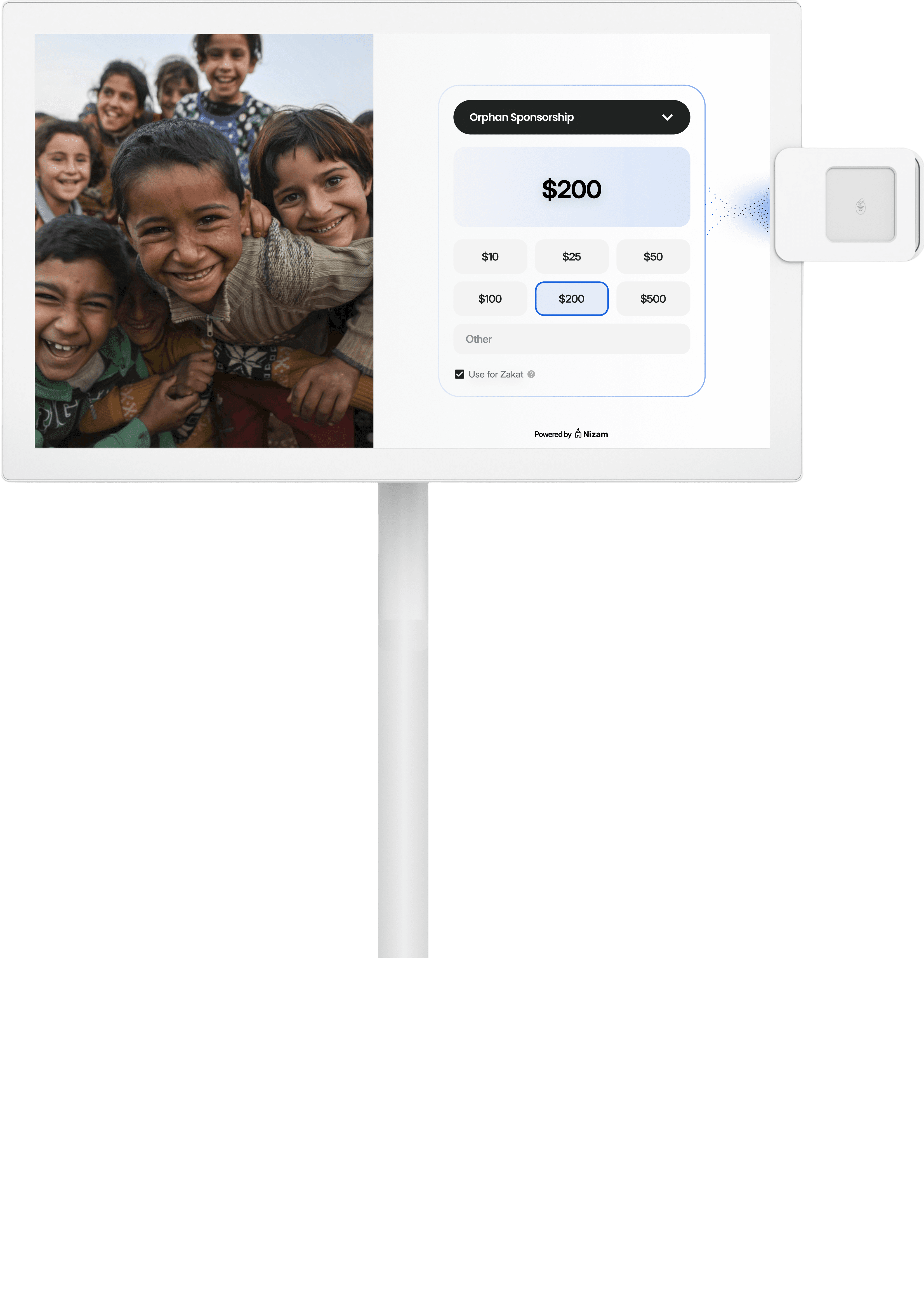 StandPro is designed to move with your community. A slim 21.5” touchscreen, smooth-rolling base, and built-in battery let you place it where giving happens — Jumu’ah, Ramadan fundraisers, NGO galas, or community dinners.