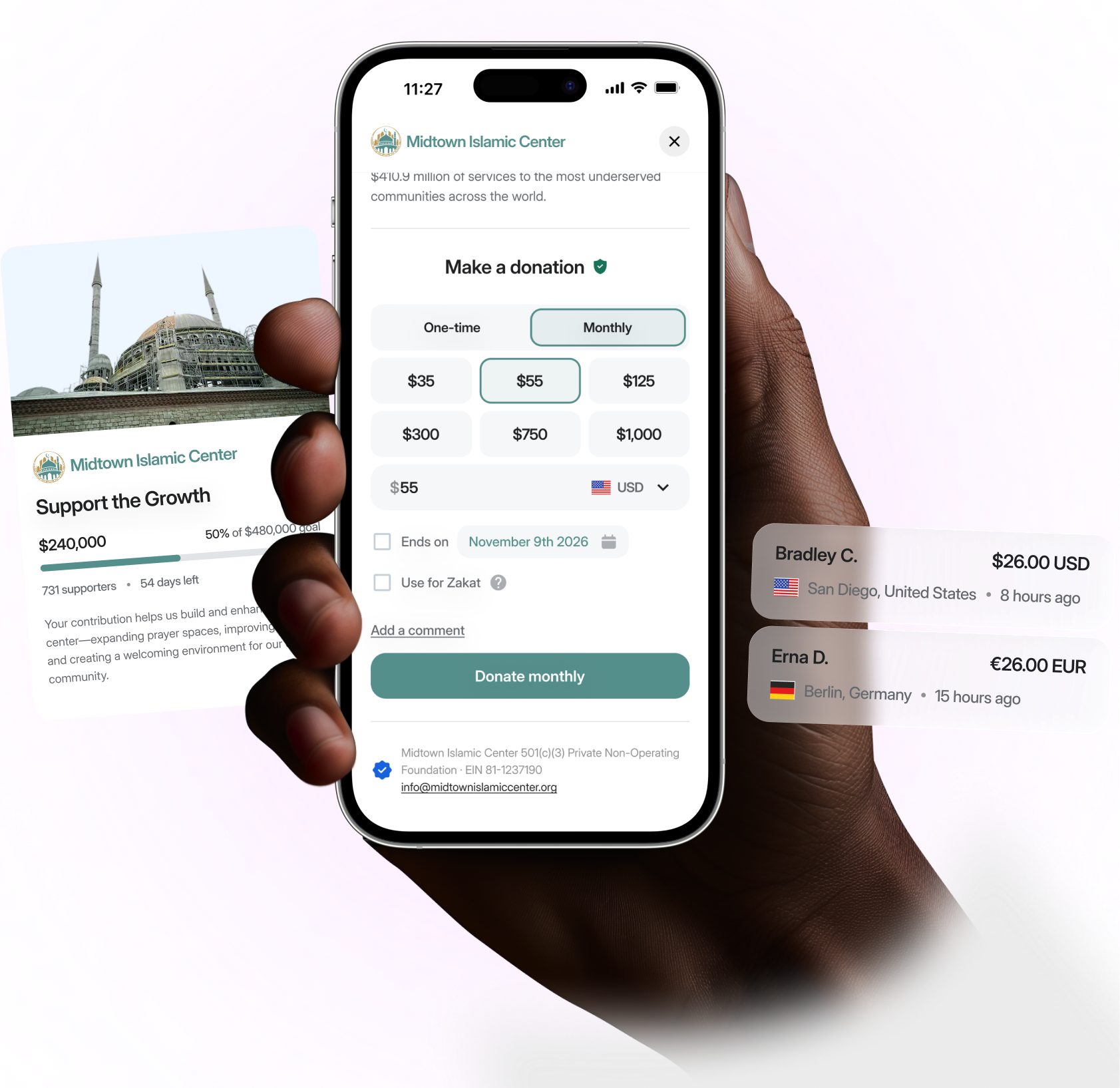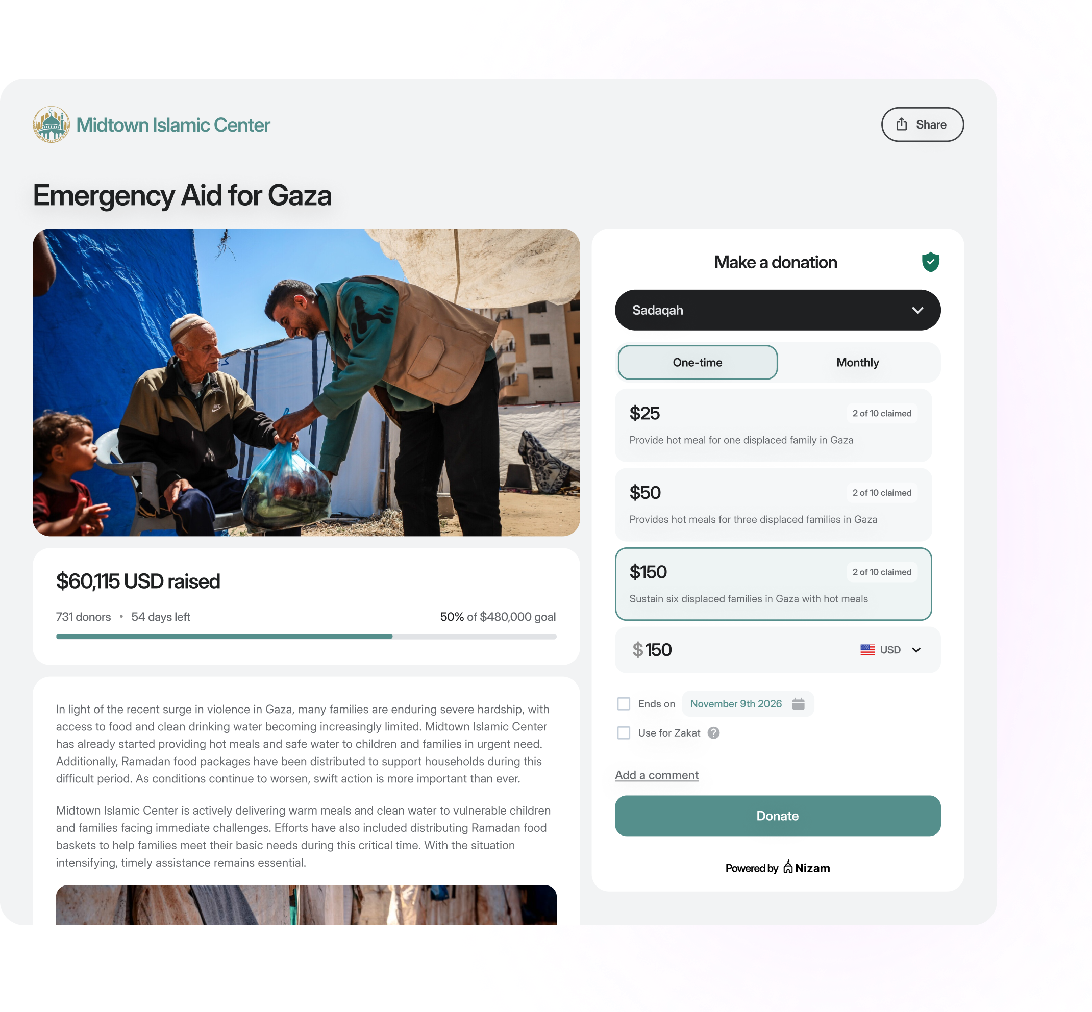 Standard donation forms process payments. Nizam Campaign Pages inspire sadaqah and zakat. Create immersive, branded fundraising campaigns for masajid that combine the emotional connection of crowdfunding with the credibility, security, and trust of your organization.