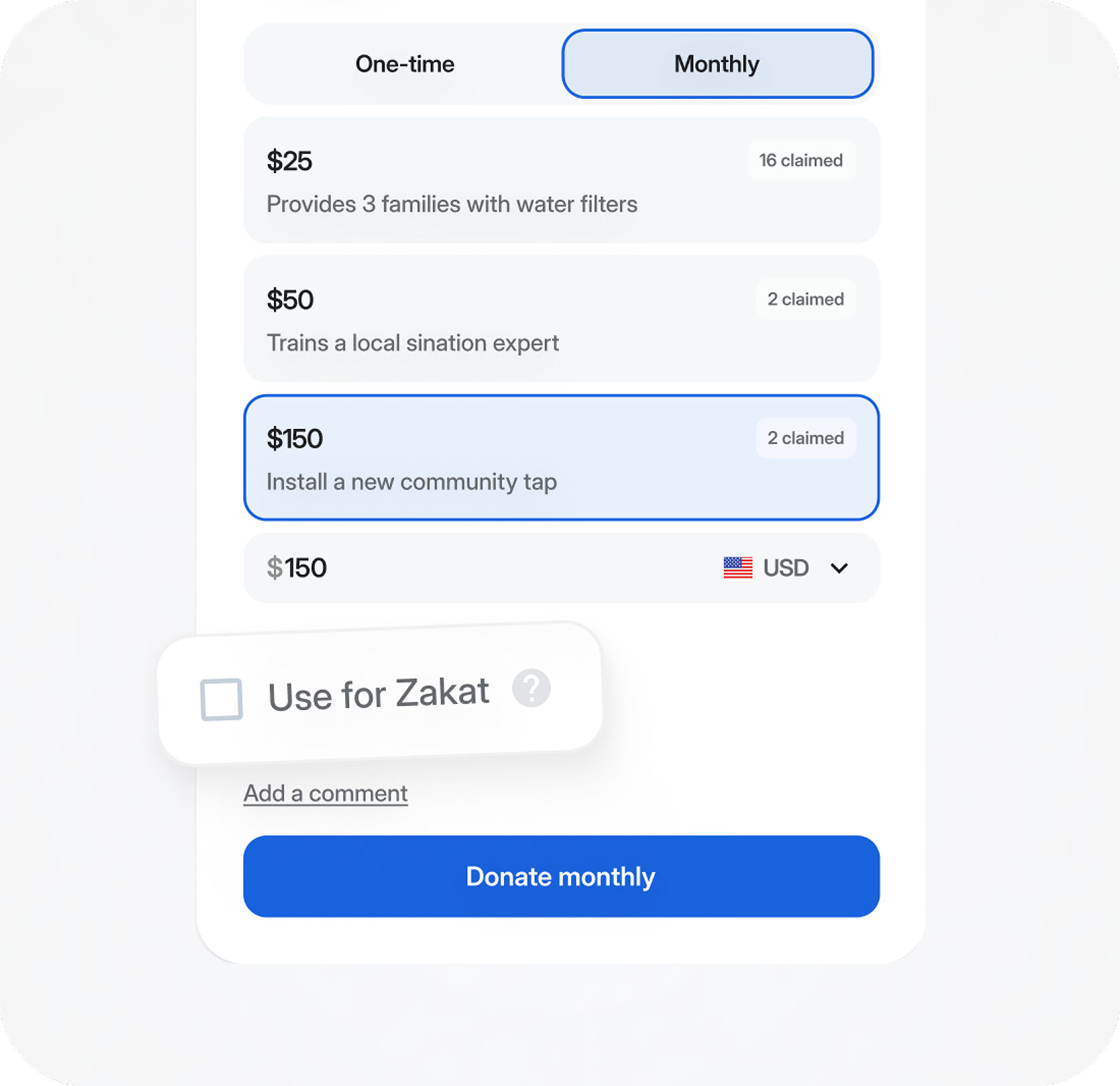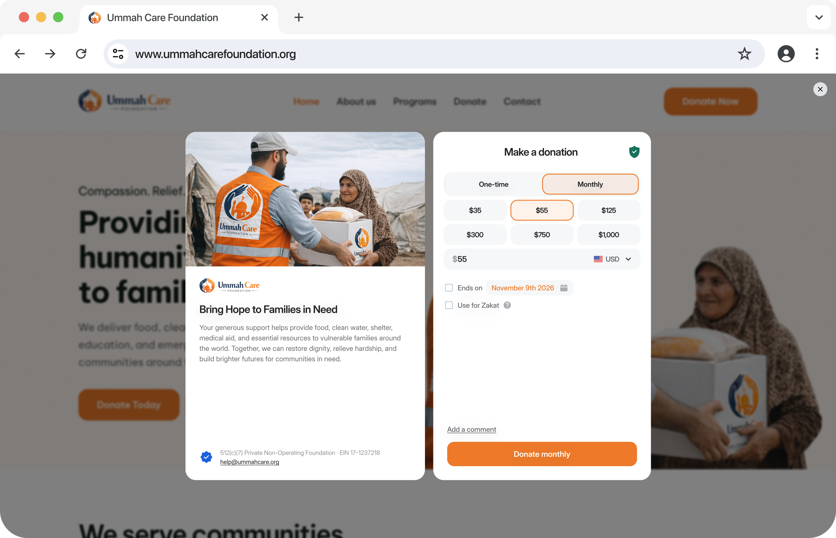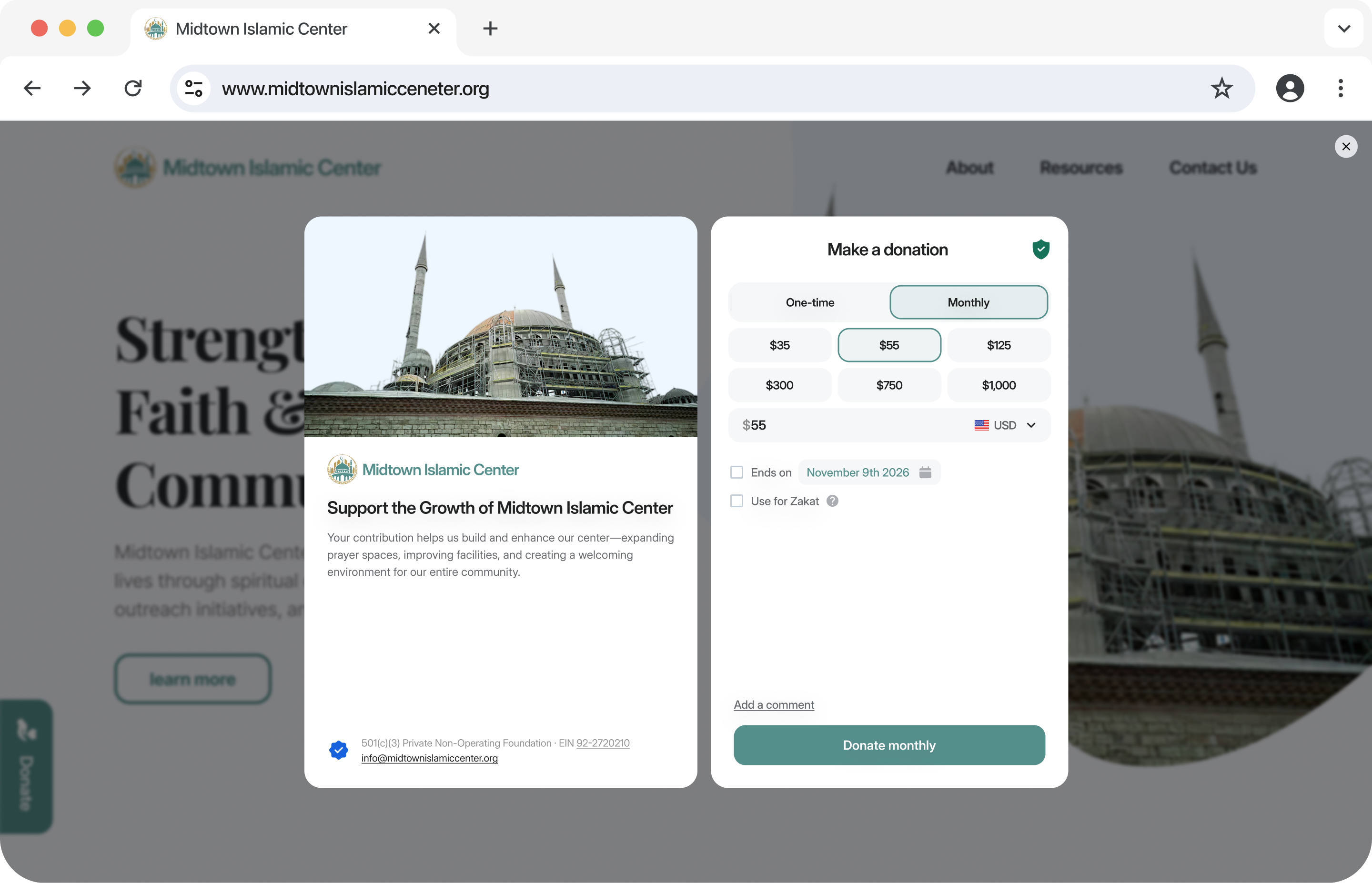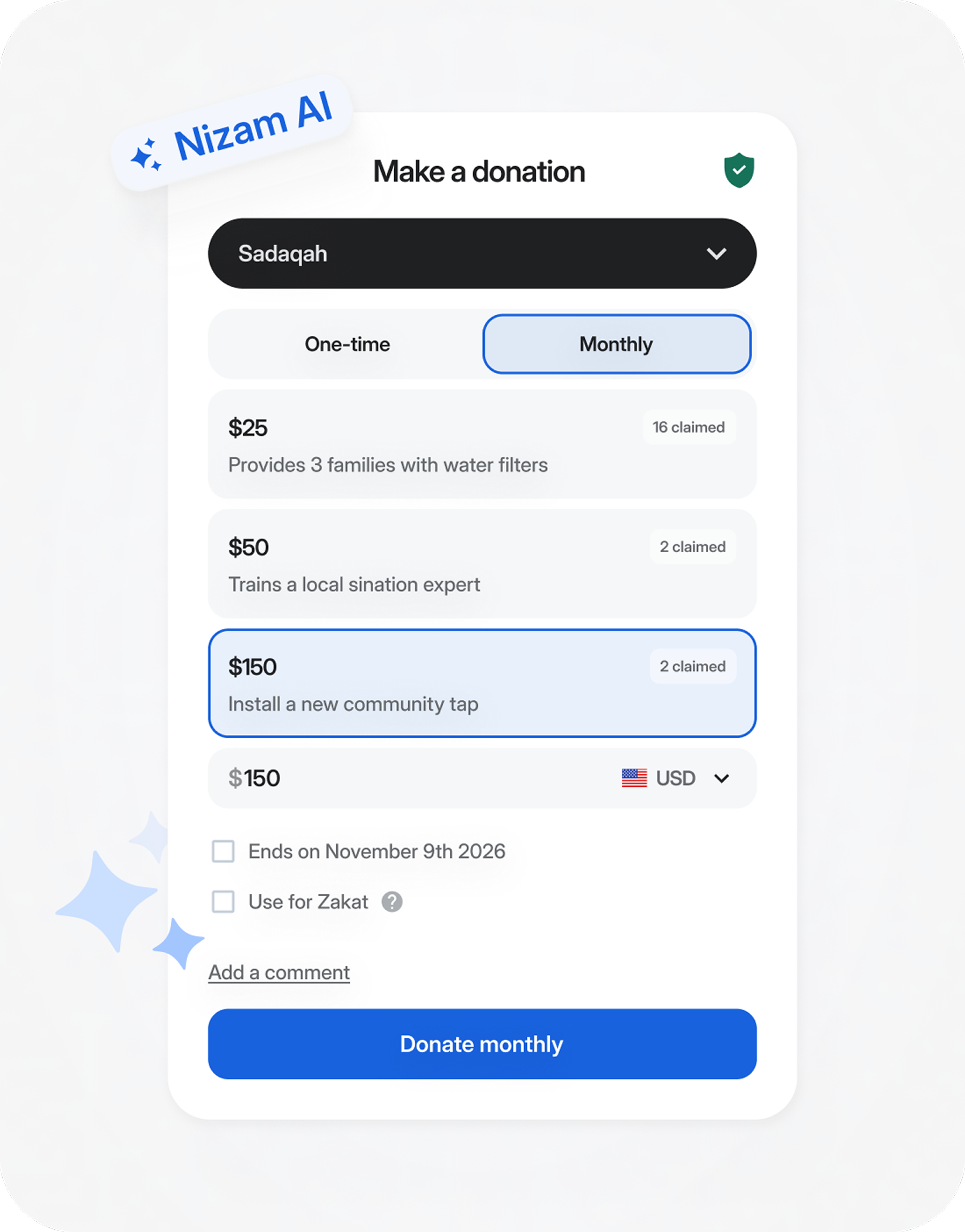 Connected directly to the Nizam Dashboard, the checkout modal uses real-time analytics to deliver the right donation ask at the right moment, maximizing conversion and generosity.